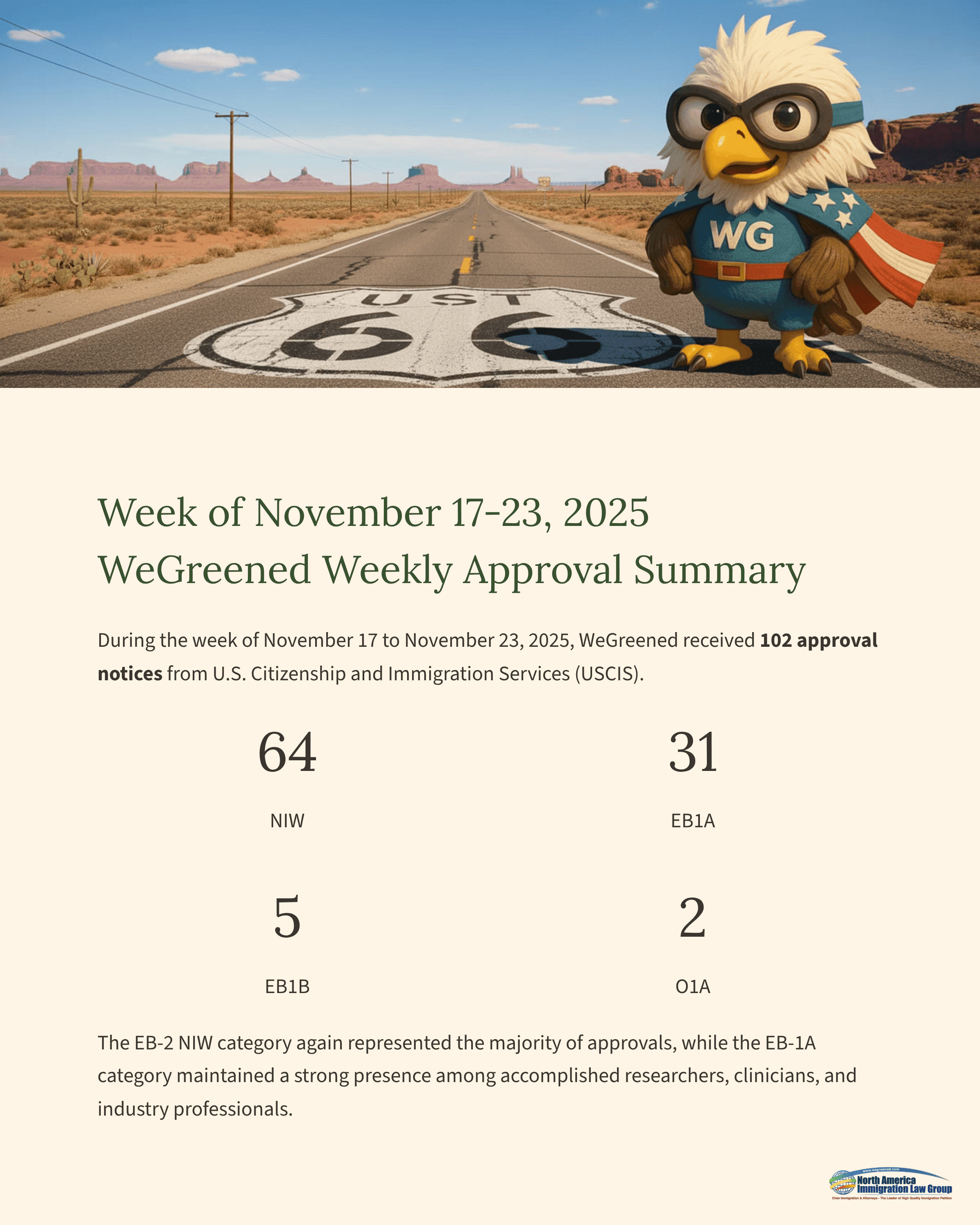 During the week of November 17 to November 23, 2025, WeGreened received 102 approval notices from U.S. Citizenship and Immigration Services (USCIS). Of the 102 approvals, 64 were for NIW (National Interest Waiver), 31 for EB1A (Alien of Extraordinary Ability), 5 for EB1B (Outstanding Professors or Researchers), and 2 for O1A (Individuals with Extraordinary Ability or Achievement). The EB-2 NIW category again represented the majority of approvals, while the EB-1A category maintained a strong presence among accomplished researchers, clinicians, and industry professionals.