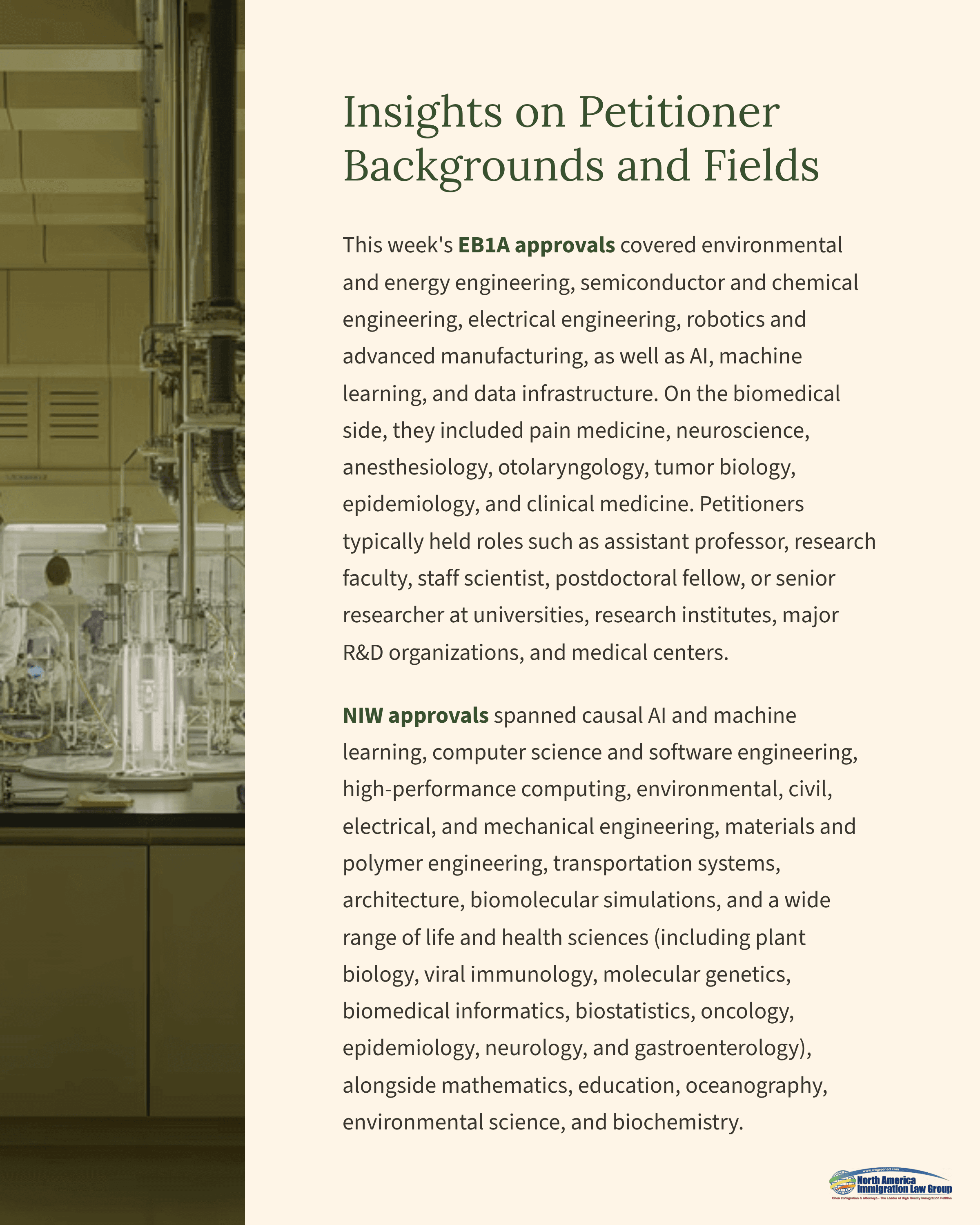 EB1A approvals this week spanned environmental and energy engineering, semiconductor and chemical engineering, electrical engineering, robotics and advanced manufacturing, and several computer science subfields involving artificial intelligence, machine learning, and data infrastructure. On the biomedical and clinical side, EB1A petitioners worked in pain medicine, neuroscience, anesthesiology, otolaryngology, tumor biology, epidemiology, and clinical medicine. Many petitioners served at universities and research institutes as assistant professors, research assistant professors, staff scientists, postdoctoral fellows, and senior researchers, while others worked in distinguished R&D organizations or medical centers in high-responsibility roles.