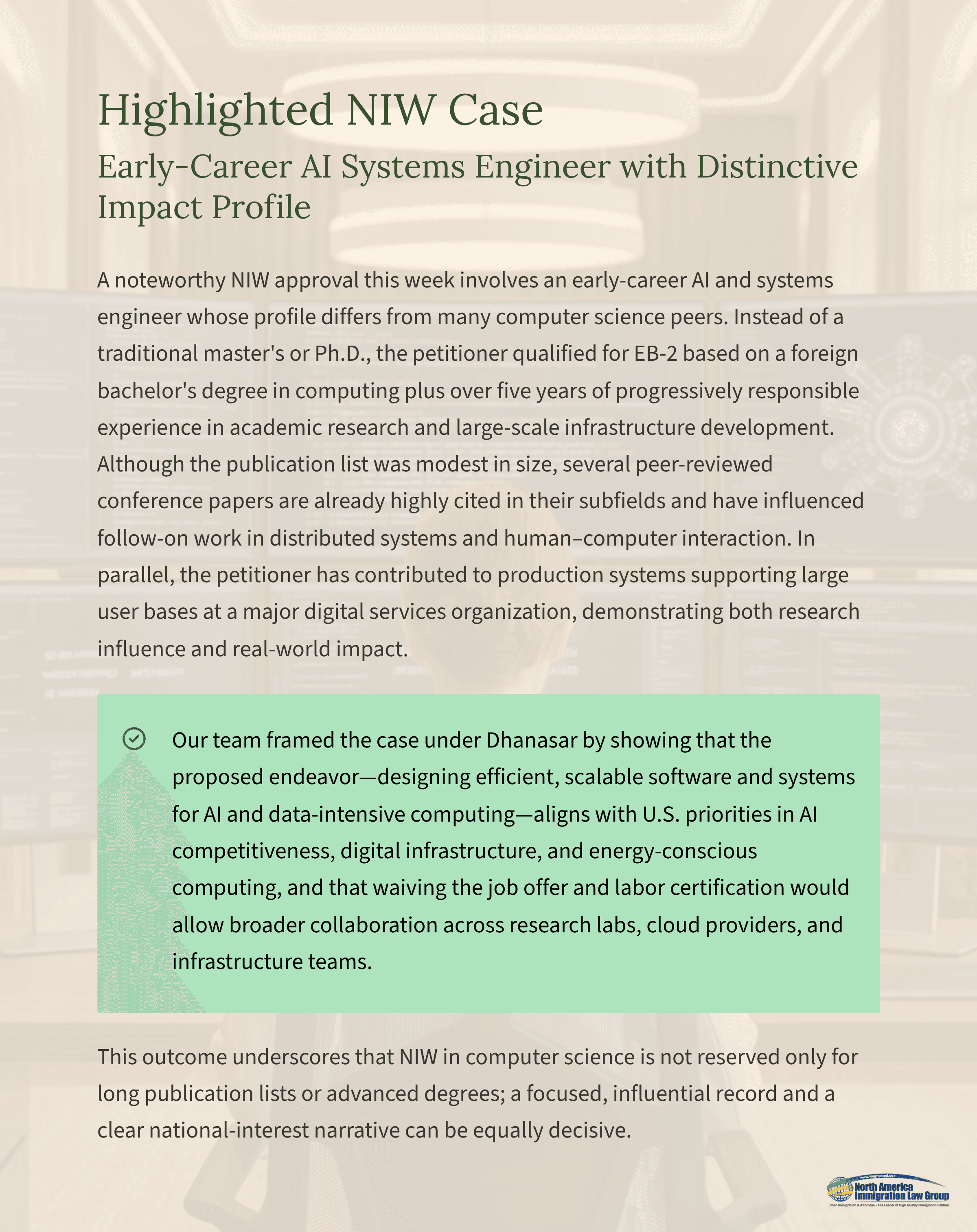 Highlighted NIW Case: Early-Career AI Systems Engineer with Distinctive Impact Profile