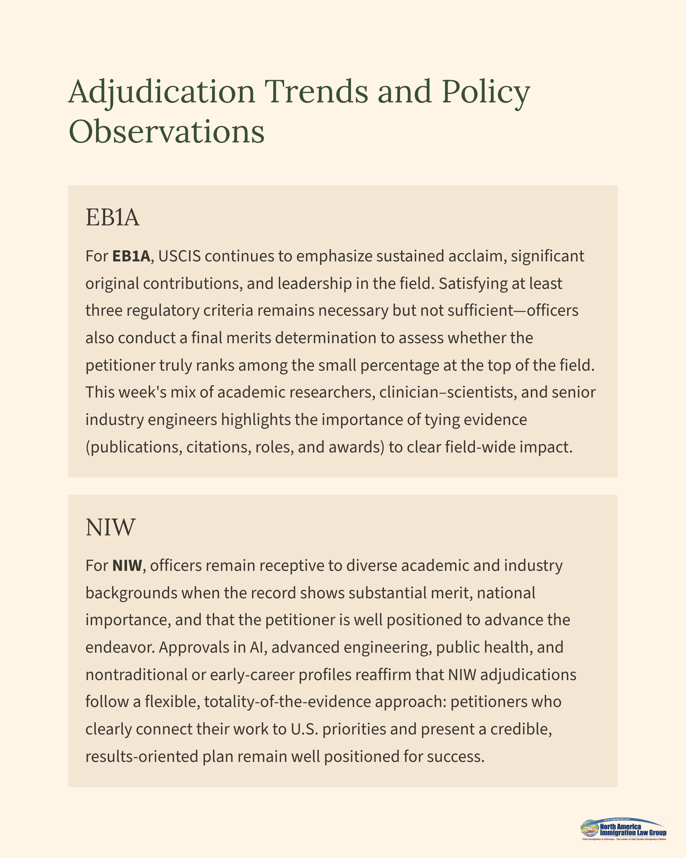 EB1A: USCIS continues to focus on sustained acclaim, significant original contributions, and leadership in the field. Meeting at least three of the EB1A regulatory criteria remains necessary but not sufficient; officers also conduct a rigorous final merits analysis to determine whether the petitioner ranks among the small percentage at the very top of the field. This week’s EB1A approvals, which include traditional academic researchers, clinician–scientists, and senior industry engineers, underscore the importance of presenting criterion-by-criterion documentation that connects publications, citations, awards, and leadership roles to clear, field-wide influence rather than purely internal performance metrics.