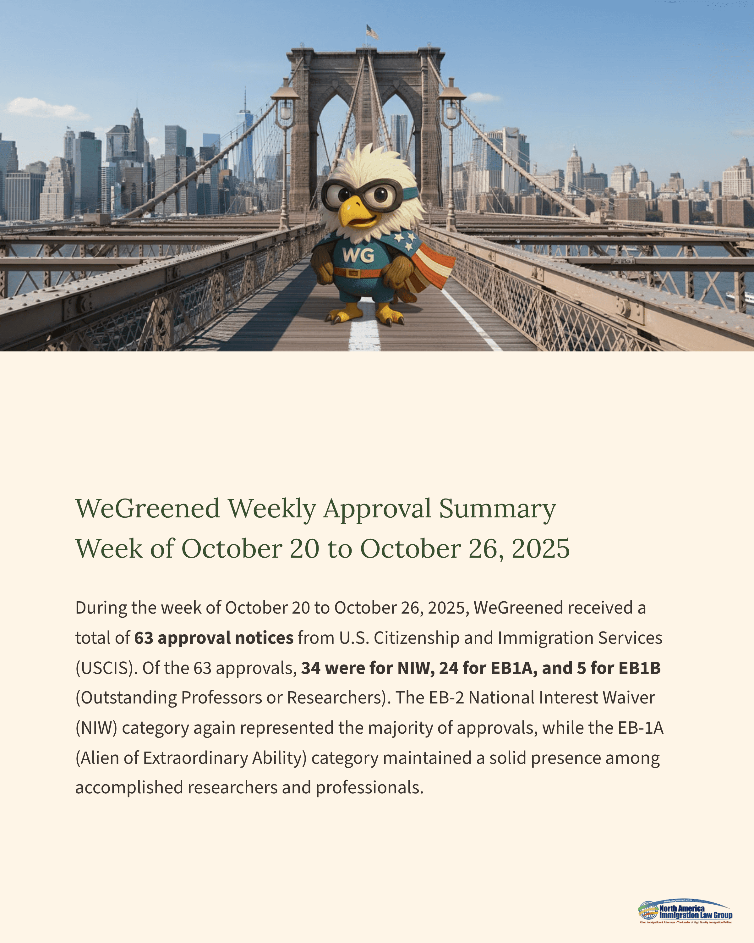 During the week of October 20 to October 26, 2025, WeGreened received a total of 63 approval notices from U.S. Citizenship and Immigration Services (USCIS). Of the 63 approvals, 34 were for NIW, 24 for EB1A, and 5 for EB1B (Outstanding Professors or Researchers). The EB-2 National Interest Waiver (NIW) category again represented the majority of approvals, while the EB-1A (Alien of Extraordinary Ability) category maintained a solid presence among accomplished researchers and professionals.