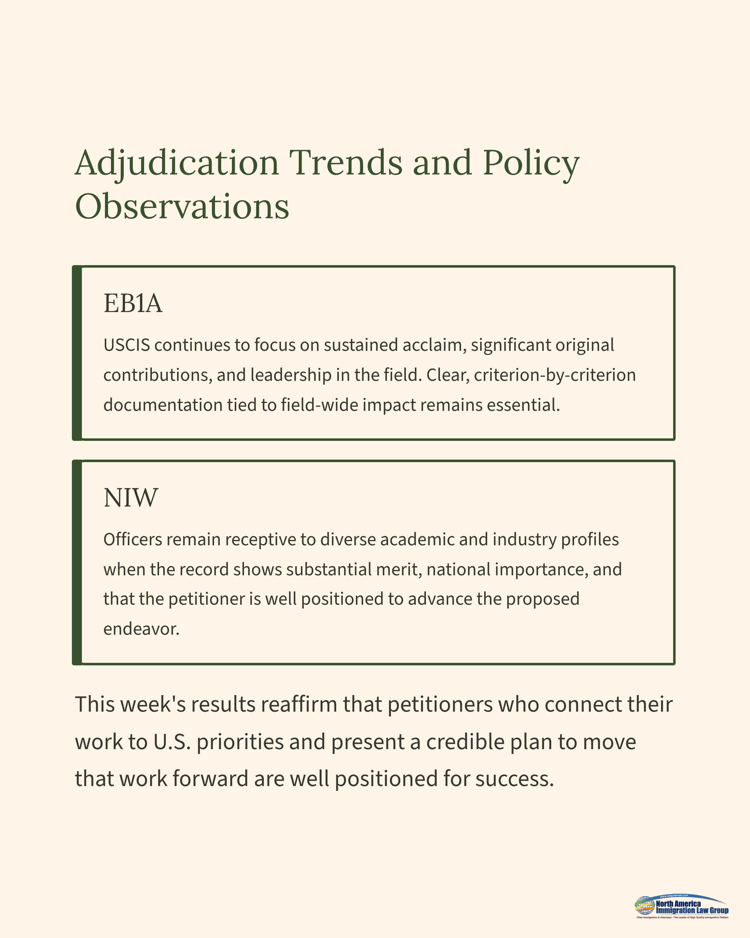 EB1A: USCIS continues to focus on sustained acclaim, significant original contributions, and leadership in the field. Clear, criterion-by-criterion documentation tied to field-wide impact remains essential.