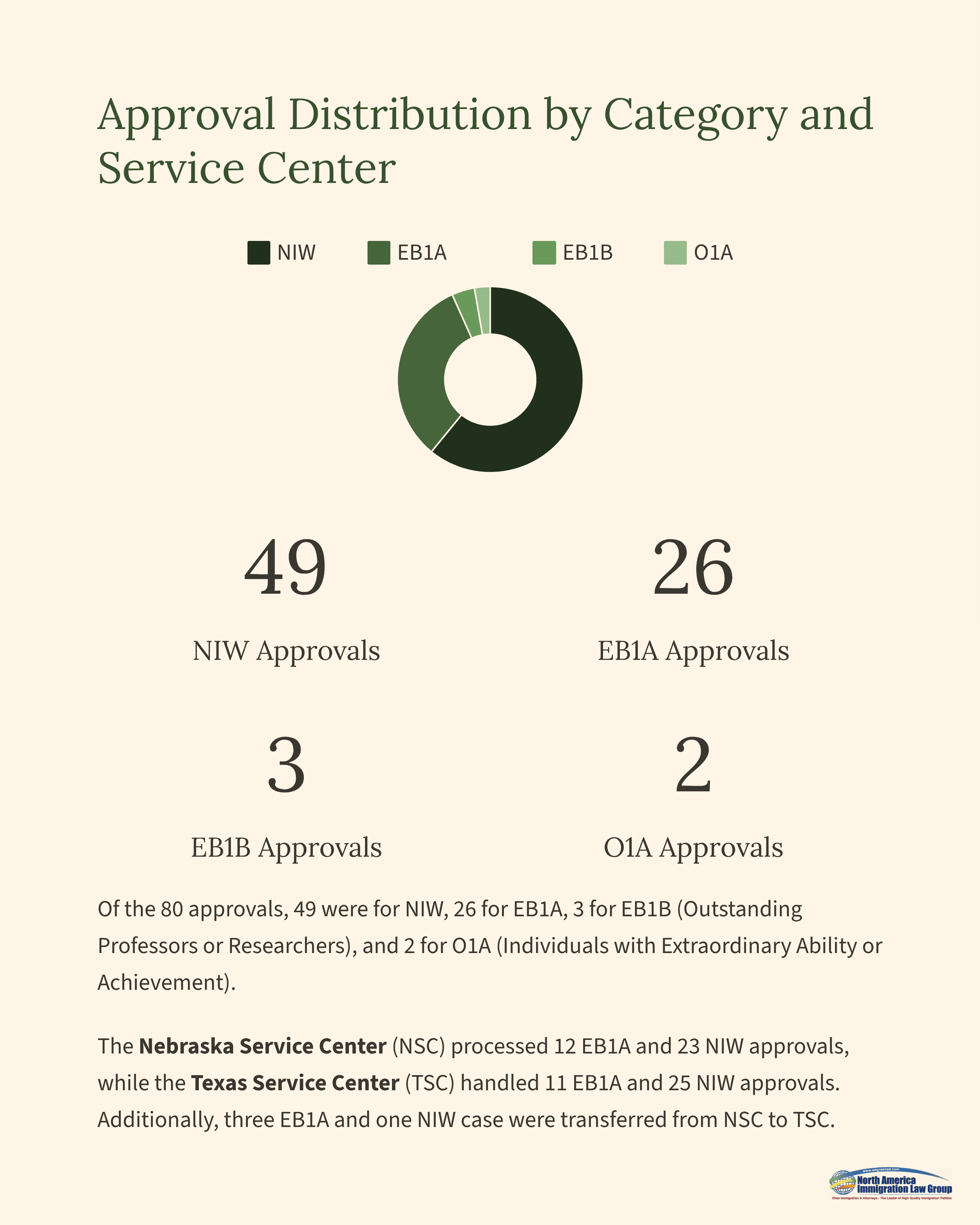 Of the 80 approvals, 49 were for NIW, 26 for EB1A, 3 for EB1B (Outstanding Professors or Researchers), and 2 for O1A (Individuals with Extraordinary Ability or Achievement).
