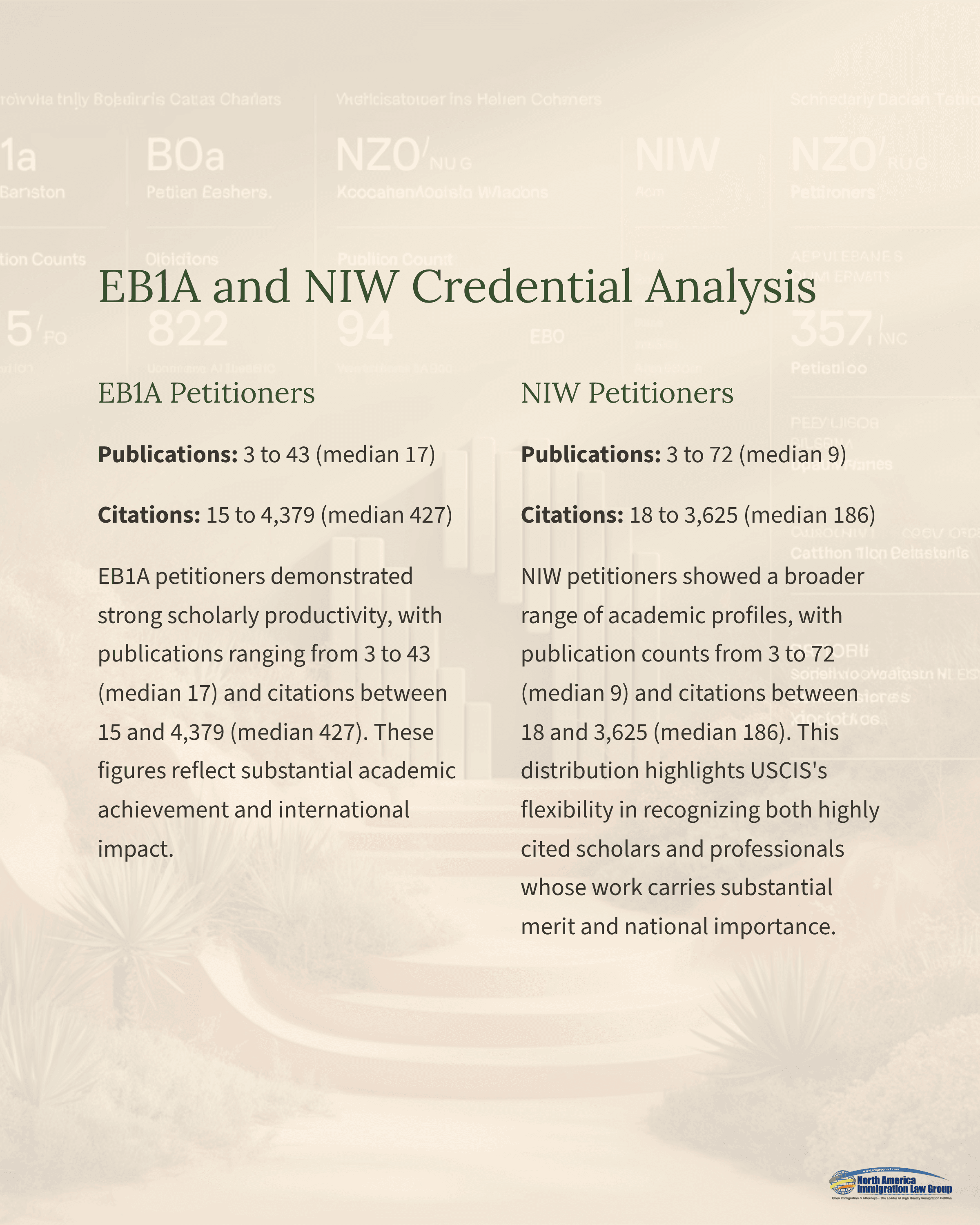 EB1A petitioners demonstrated strong scholarly productivity, with publications ranging from 3 to 43 (median 17) and citations between 15 and 4,379 (median 427). These figures reflect substantial academic achievement and international impact.