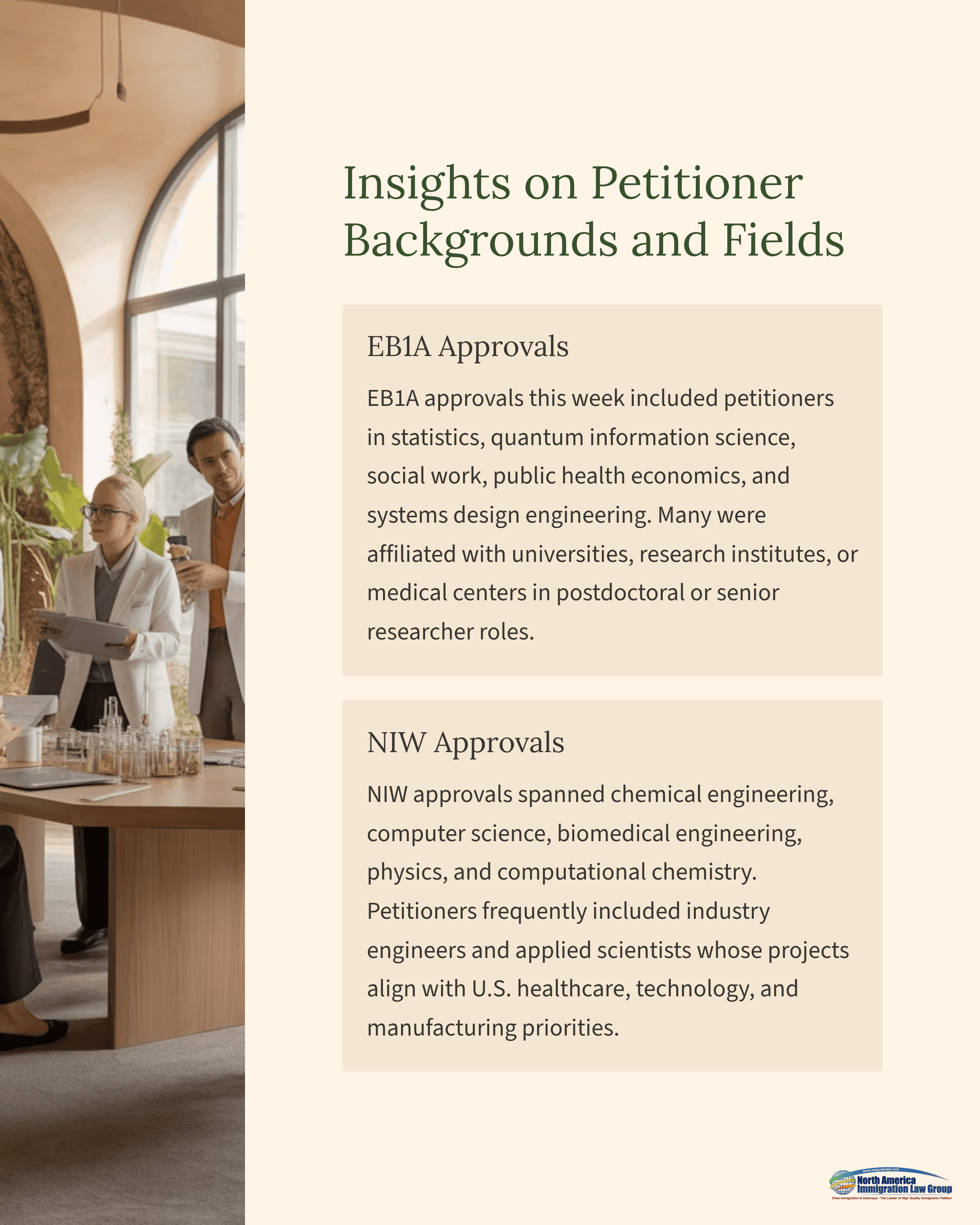 EB1A approvals this week included petitioners in statistics, quantum information science, social work, public health economics, and systems design engineering. Many were affiliated with universities, research institutes, or medical centers in postdoctoral or senior researcher roles.
