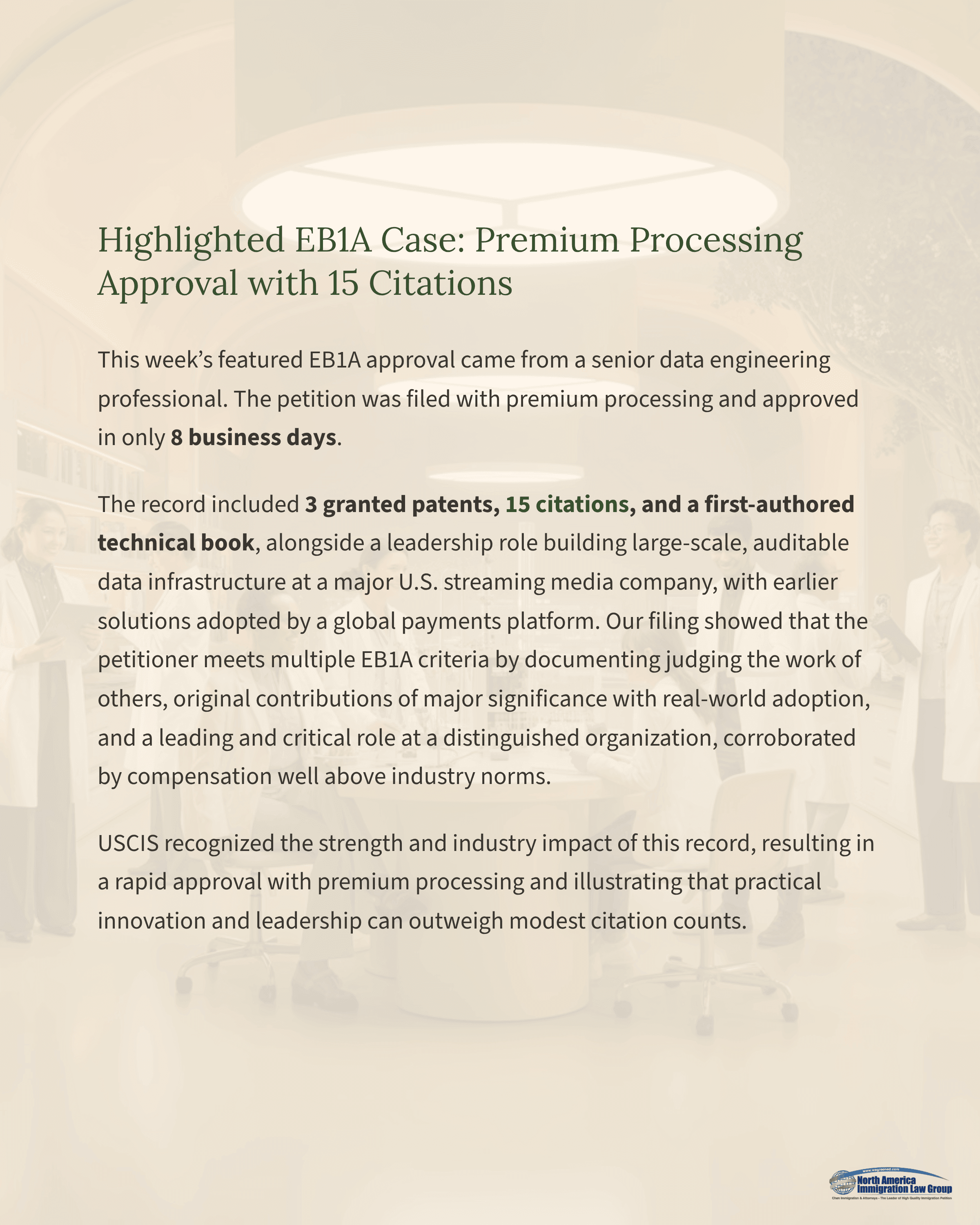 One notable EB1A approval this week involved a senior data engineering professional with 15 citations, three granted patents, and a first-authored technical book. The petitioner leads large-scale, reliable, and auditable data infrastructure at a major U.S. streaming media company, with prior solutions adopted by a global payments platform. The case was filed with premium processing and approved in only 8 business days.