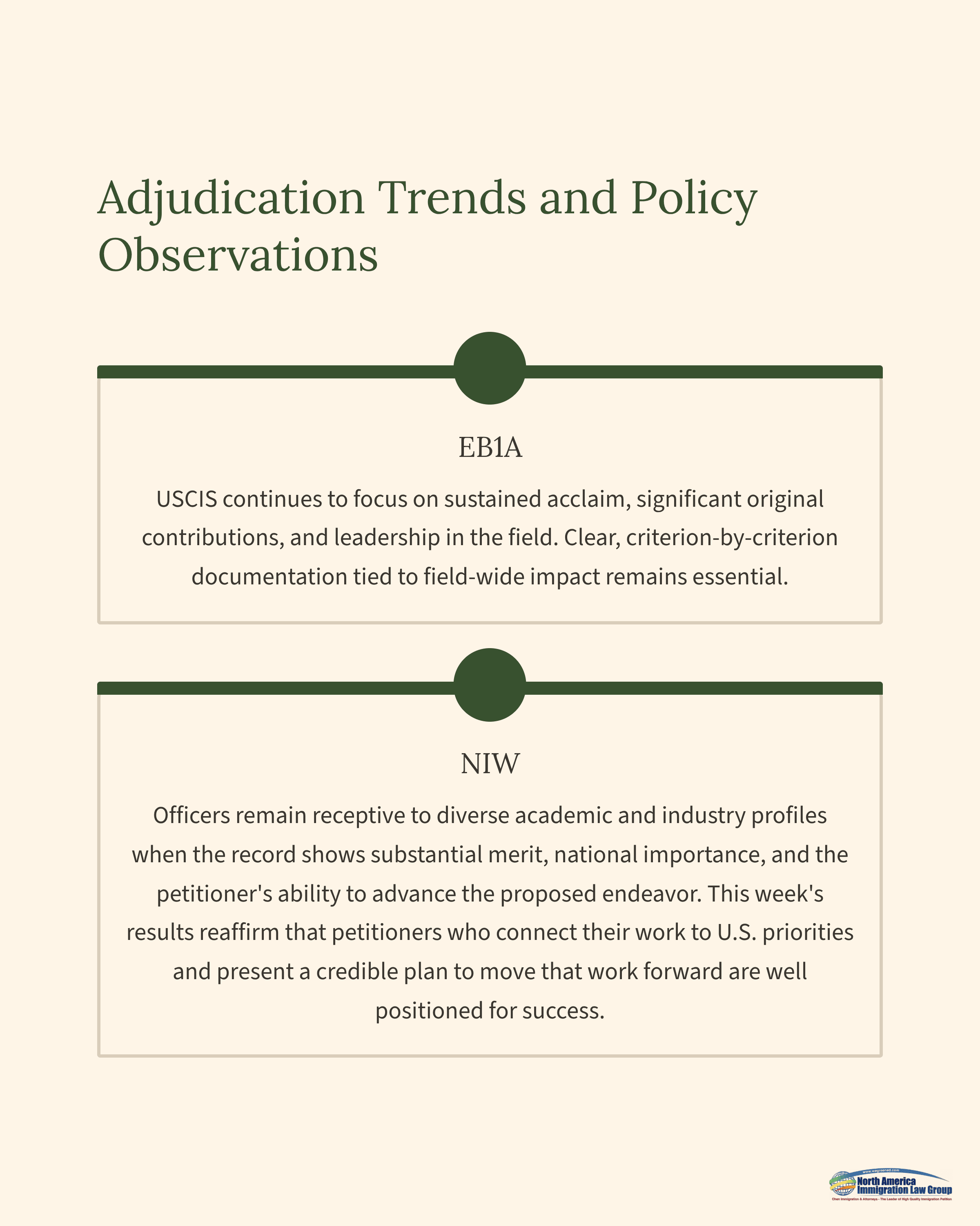NIW: Officers remain receptive to diverse academic and industry profiles when the record shows substantial merit, national importance, and the petitioner’s ability to advance the proposed endeavor. This week’s results reaffirm that petitioners who connect their work to U.S. priorities and present a credible plan to move that work forward are well positioned for success.