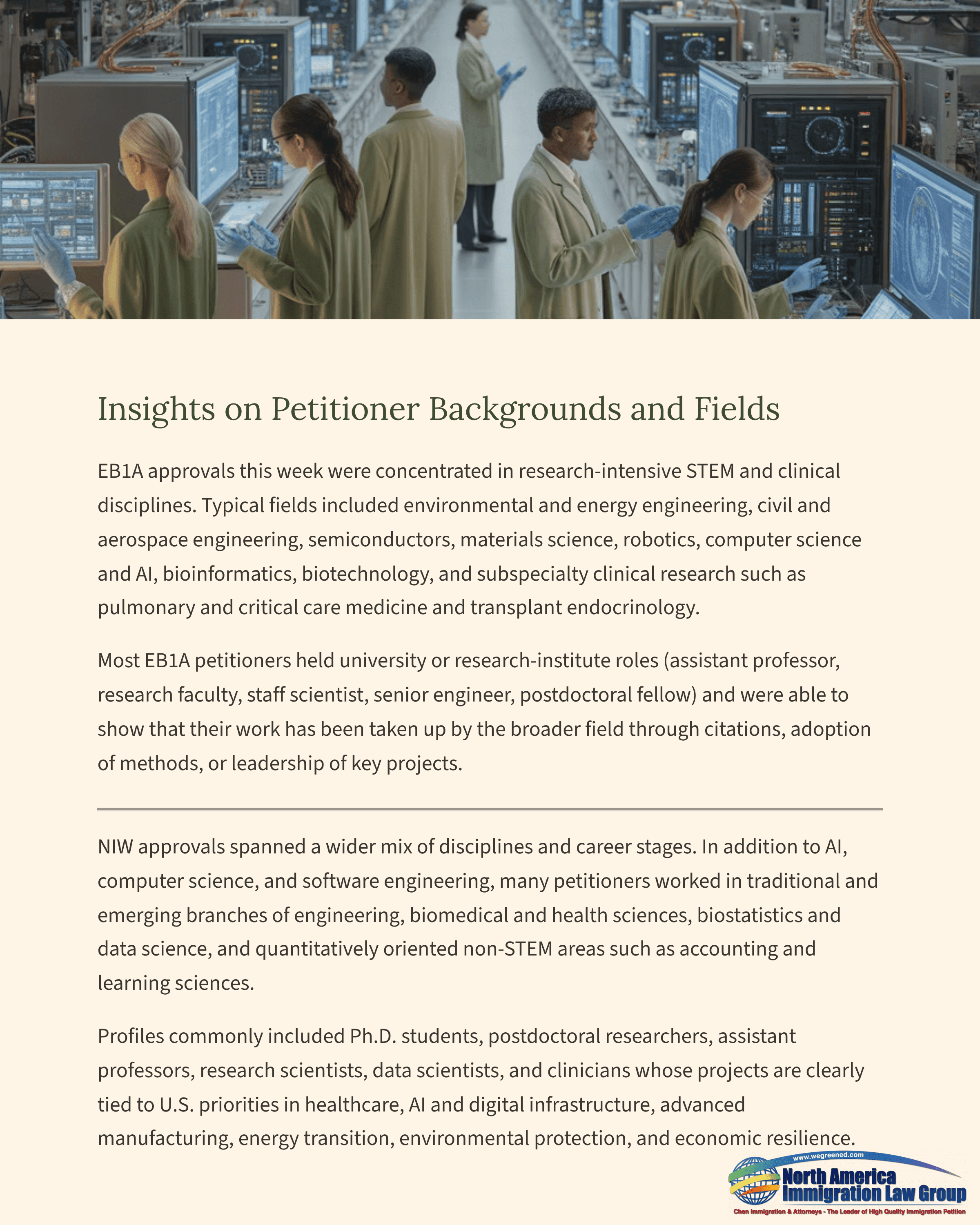 EB1A approvals this week were concentrated in research-intensive STEM and clinical disciplines. Typical fields included environmental and energy engineering, civil and aerospace engineering, semiconductors, materials science, robotics, computer science and AI, bioinformatics, biotechnology, and subspecialty clinical research such as pulmonary and critical care medicine and transplant endocrinology. Most EB1A petitioners held university or research-institute roles (assistant professor, research faculty, staff scientist, senior engineer, postdoctoral fellow) and were able to show that their work has been taken up by the broader field through citations, adoption of methods, or leadership of key projects.
