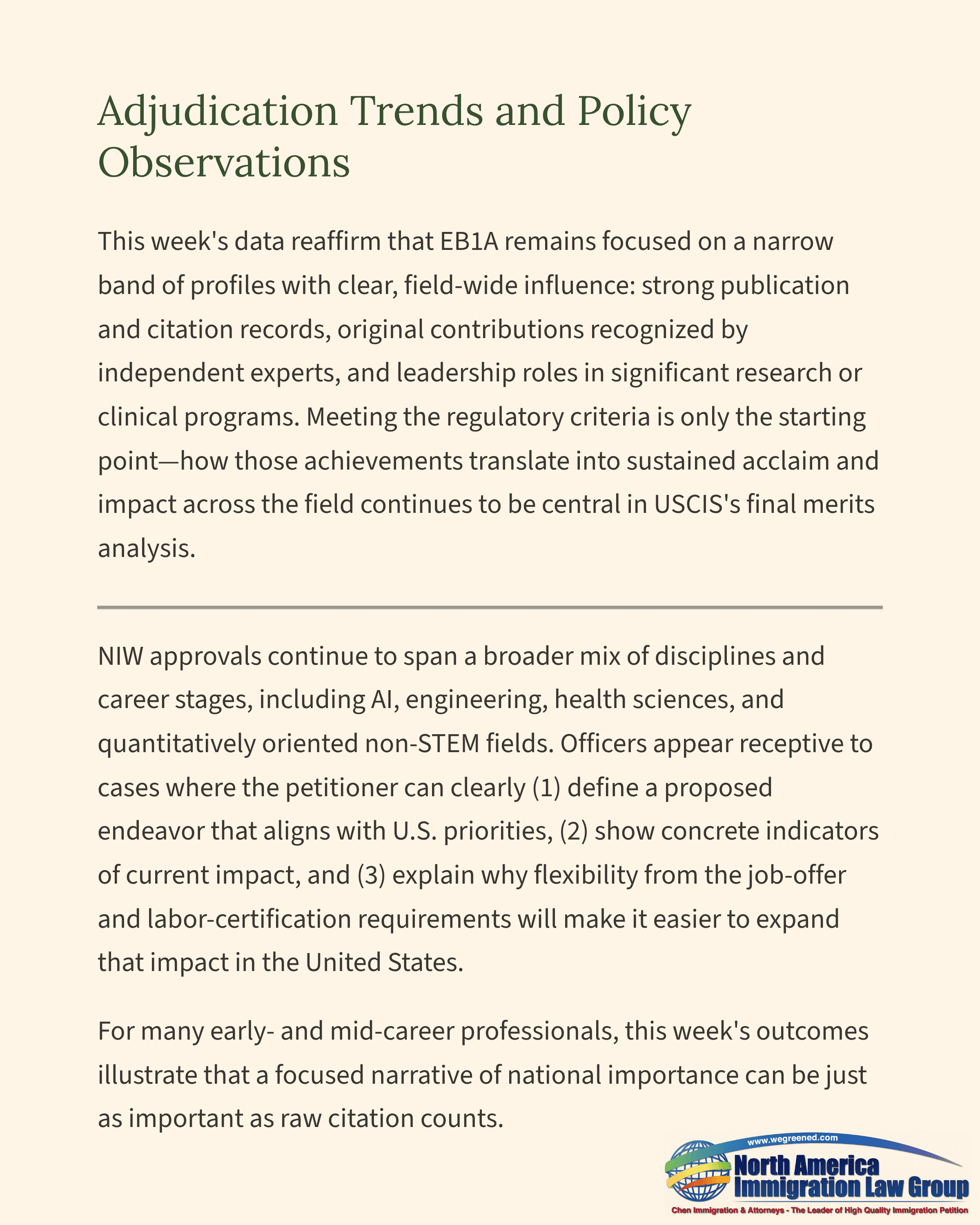 NIW approvals continue to span a broader mix of disciplines and career stages, including AI, engineering, health sciences, and quantitatively oriented non-STEM fields. Officers appear receptive to cases where the petitioner can clearly (1) define a proposed endeavor that aligns with U.S. priorities, (2) show concrete indicators of current impact, and (3) explain why flexibility from the job-offer and labor-certification requirements will make it easier to expand that impact in the United States. For many early- and mid-career professionals, this week’s outcomes illustrate that a focused narrative of national importance can be just as important as raw citation counts.